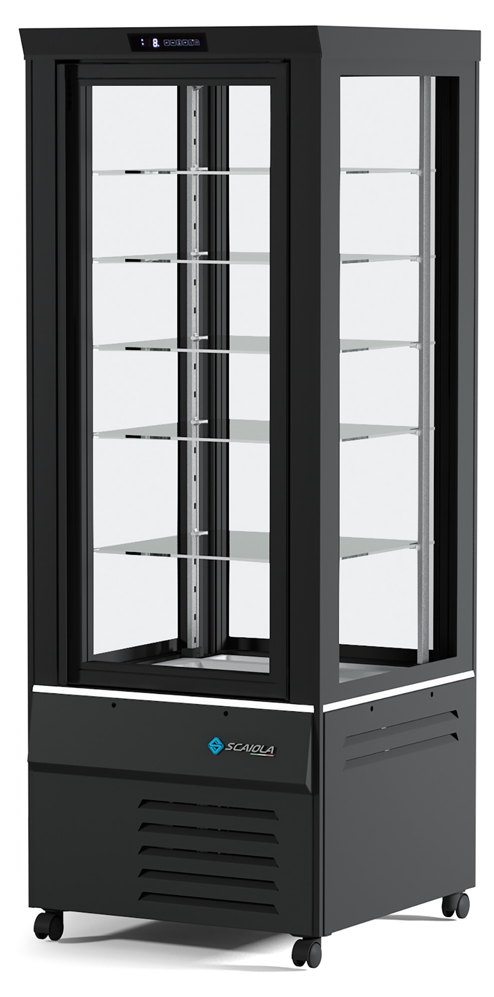 Display compartment in tempered glass with black screen printing (RAL9005). The glasses, with high thermal tightness, contain Argon gas to improve the performance and ensure brightness and high visibility of the products displayed. Glass door with invisible handle at full height, which can be customized in RAL colour (optional). Automatic defrosting and use of purified, non-toxic, and eco-friendly R290 refrigerant gas.